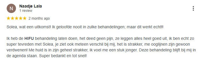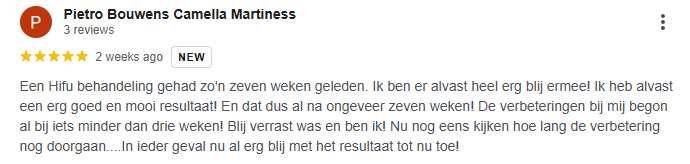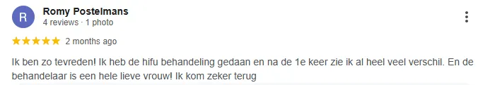 "ik ben echt verbaasd over de resultaten. Ik heb een prachtige lifting gekregen en de structuur van de huid is veel gezonder geworden. Echt een aanrader!"